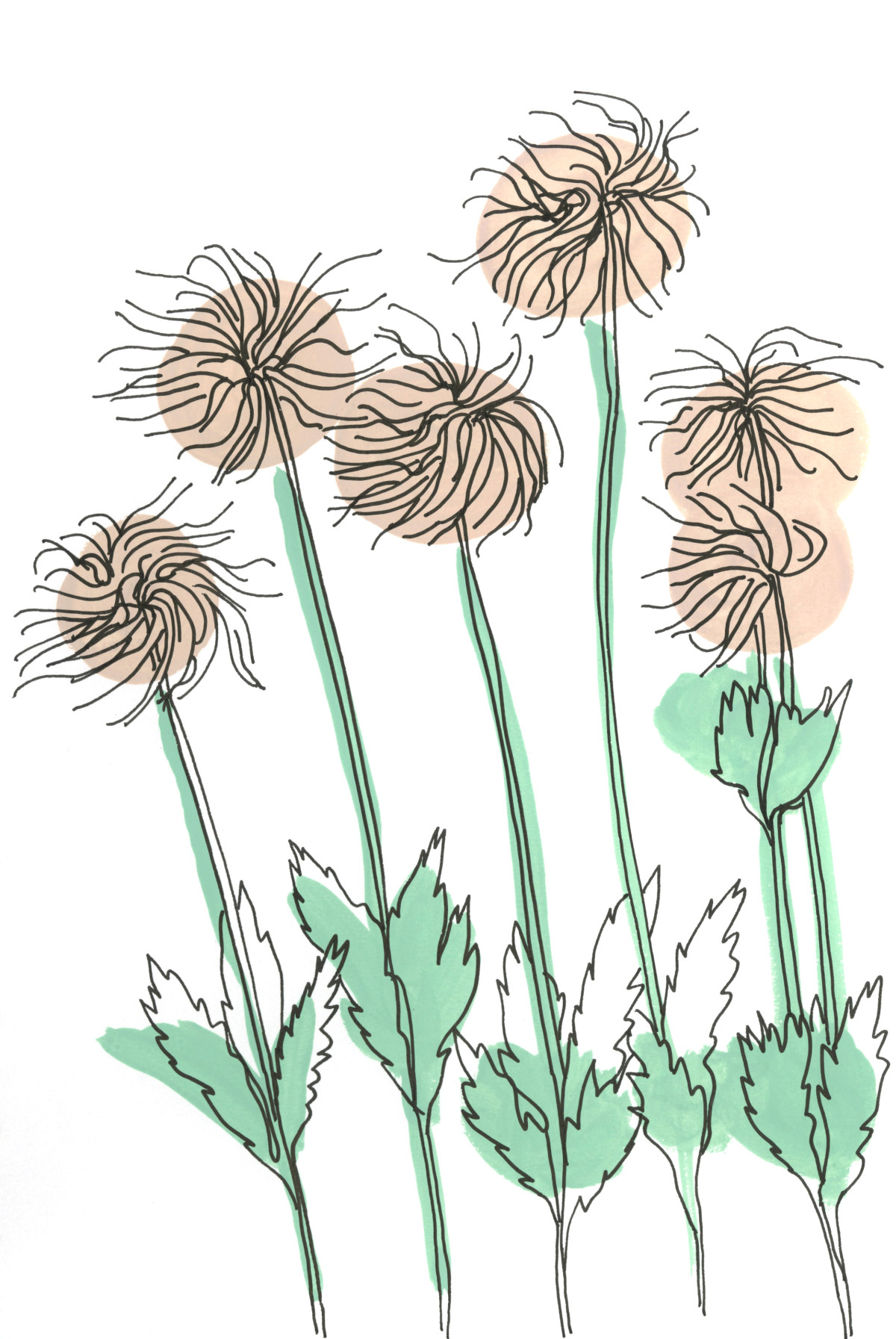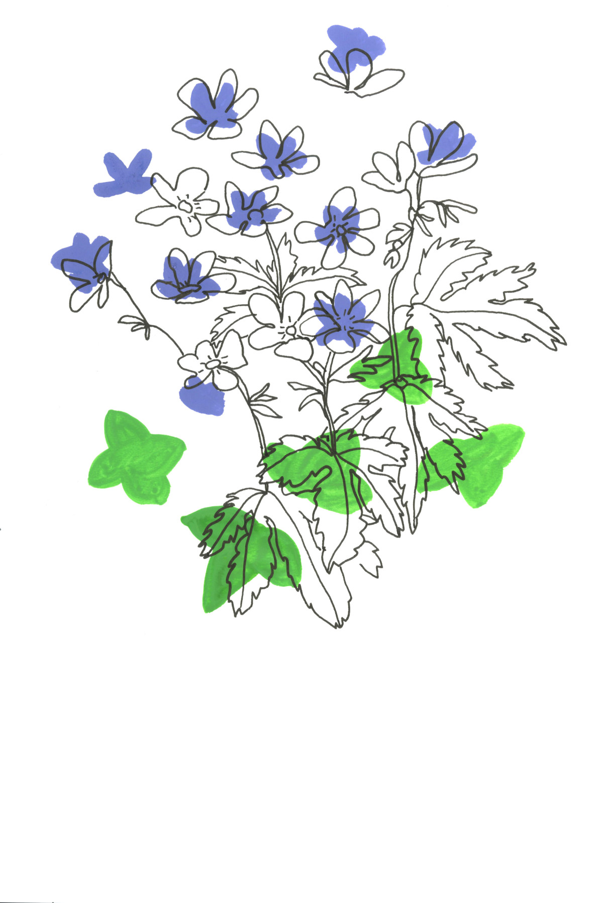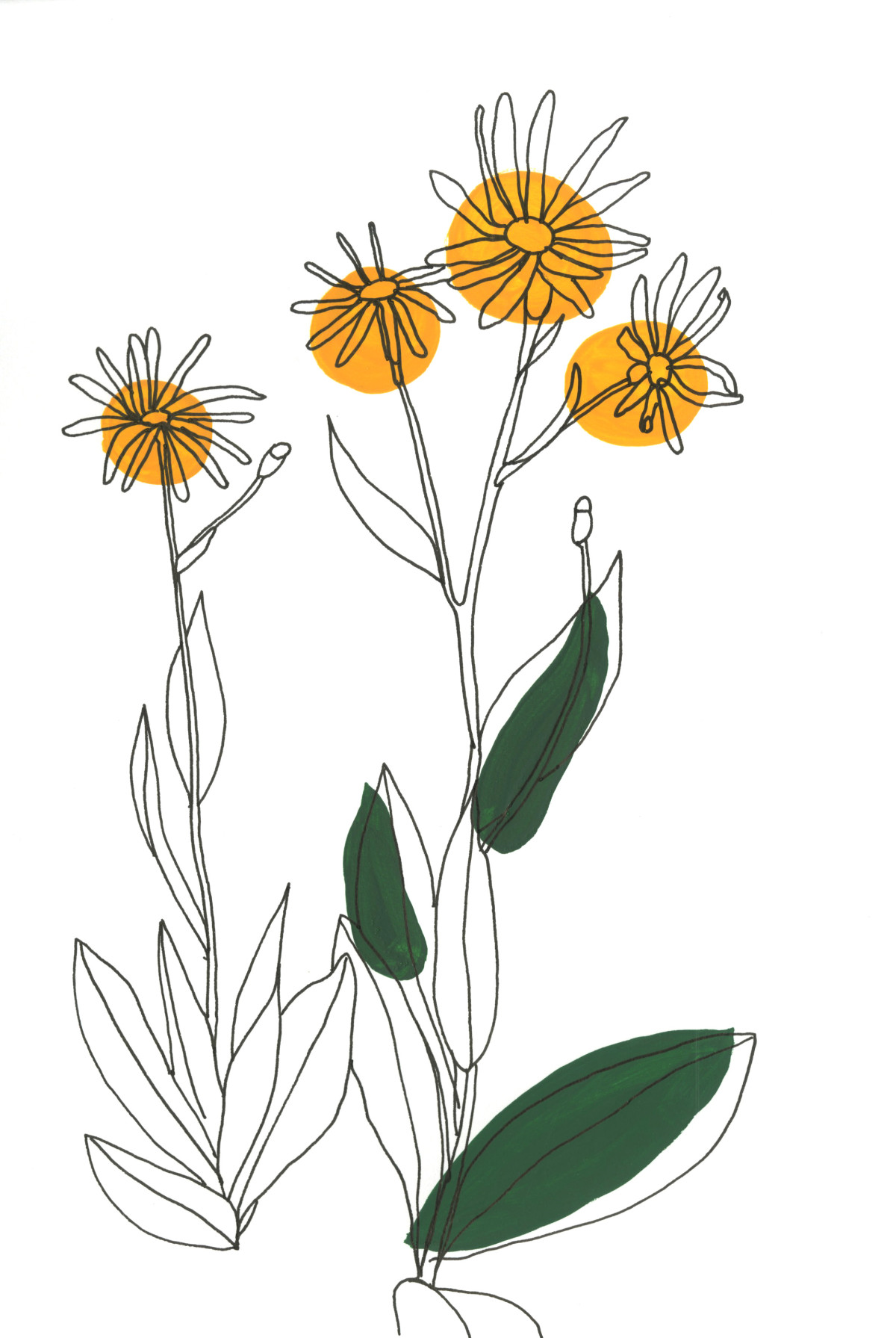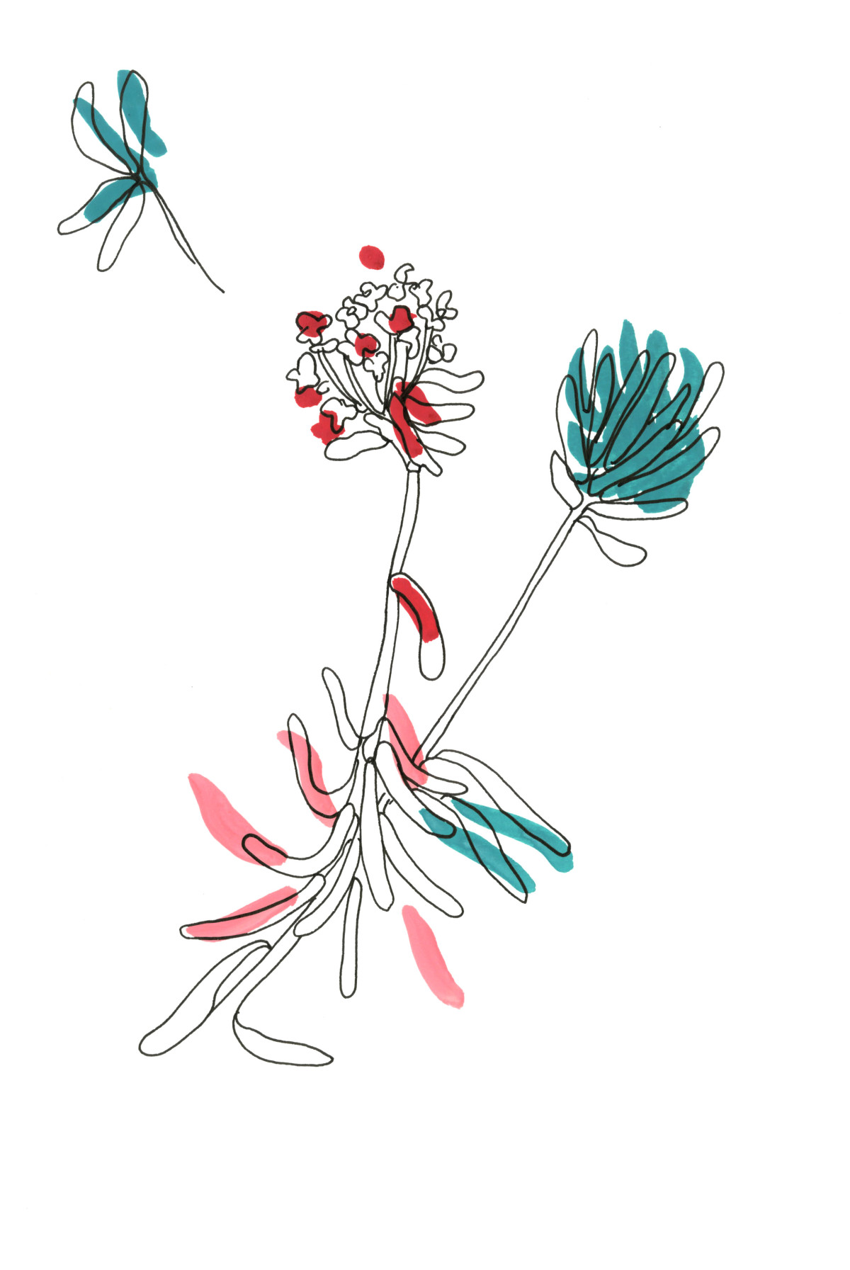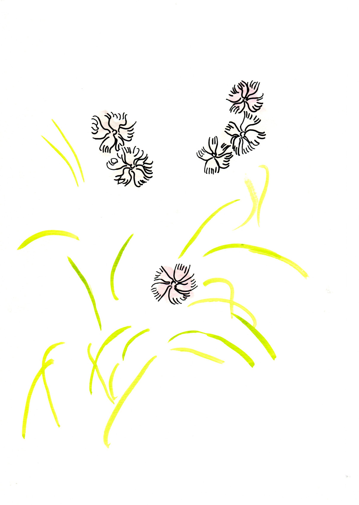 Les dessins de fleurs sont comme une sorte d’herbier surprenant débuté lors d’une résidence artistique à Sion en 2015. Ce travail s’inscrit dans les liens crées entre les randonnées en nature et le dessin. Les fleurs sont photographiées dans leur milieu naturel, puis à partir de ces images, une recherche sur la couleur des fleurs s’effectue comme point de départ. A l’aquarelle, une ou deux nuances de la plante sont déposées sur le papier. Le dessin à la ligne s’inscrit ensuite directement mettant en évidence l’aspect graphique des plantes.Des décalages entre les surfaces colorées et les lignes à l’encre de Chine se produisent donnant à cet «herbier» un caractère singulier.