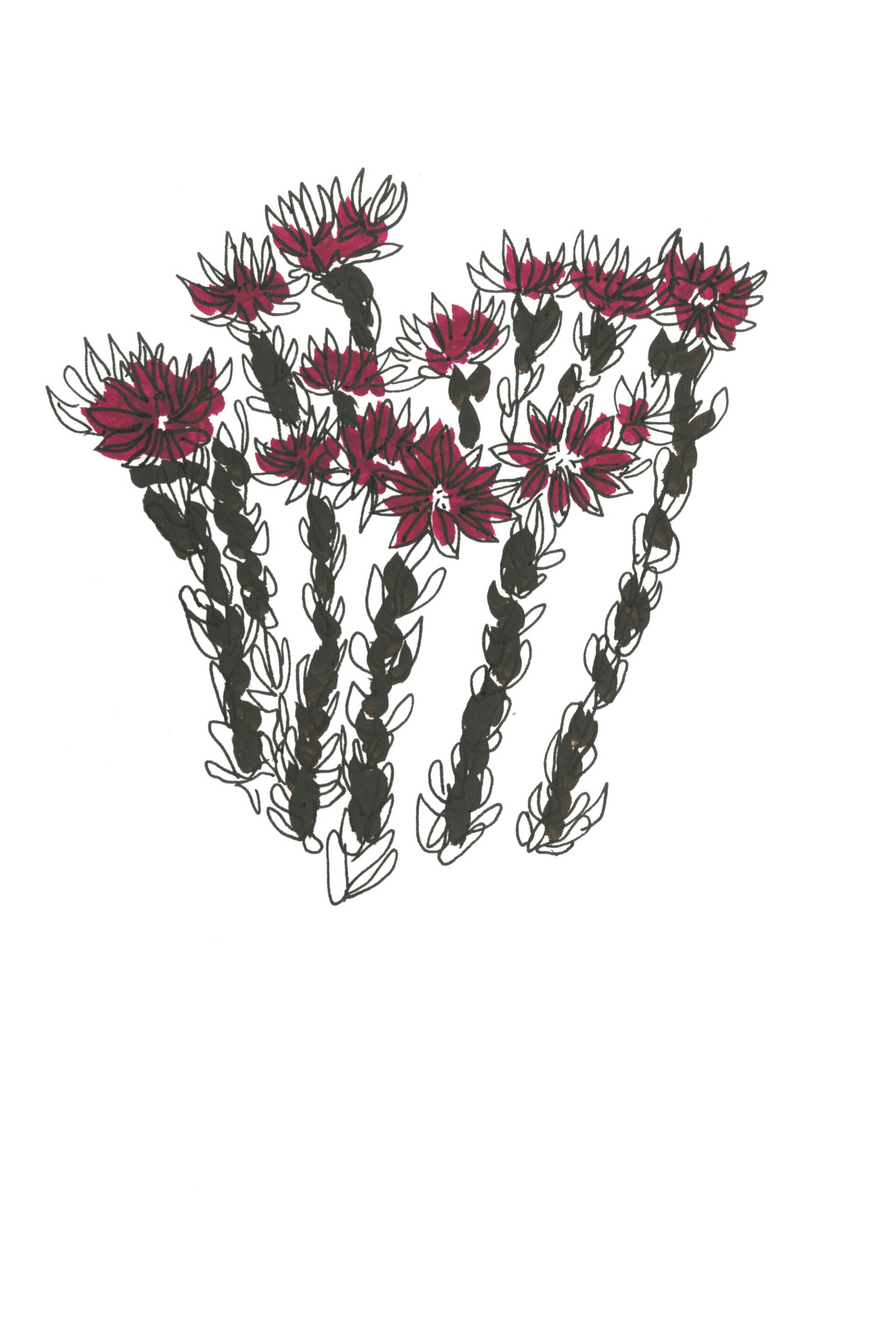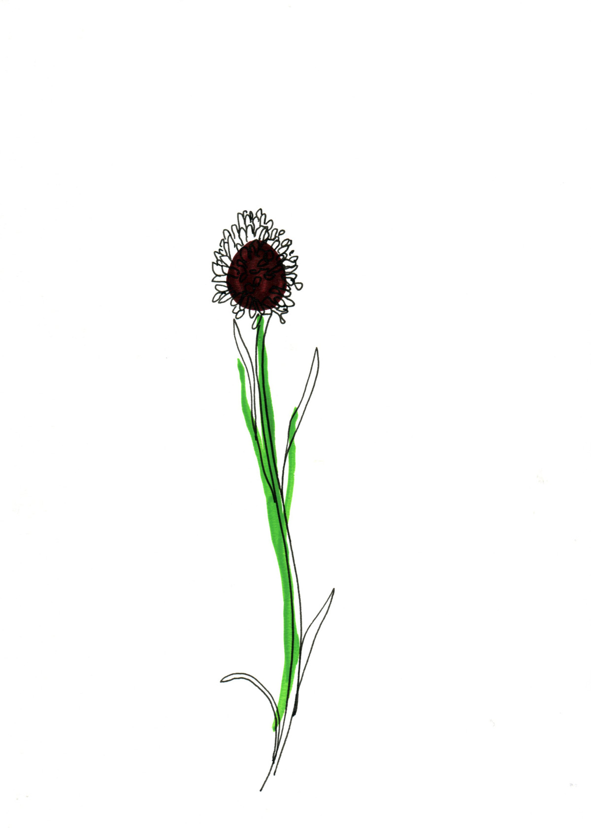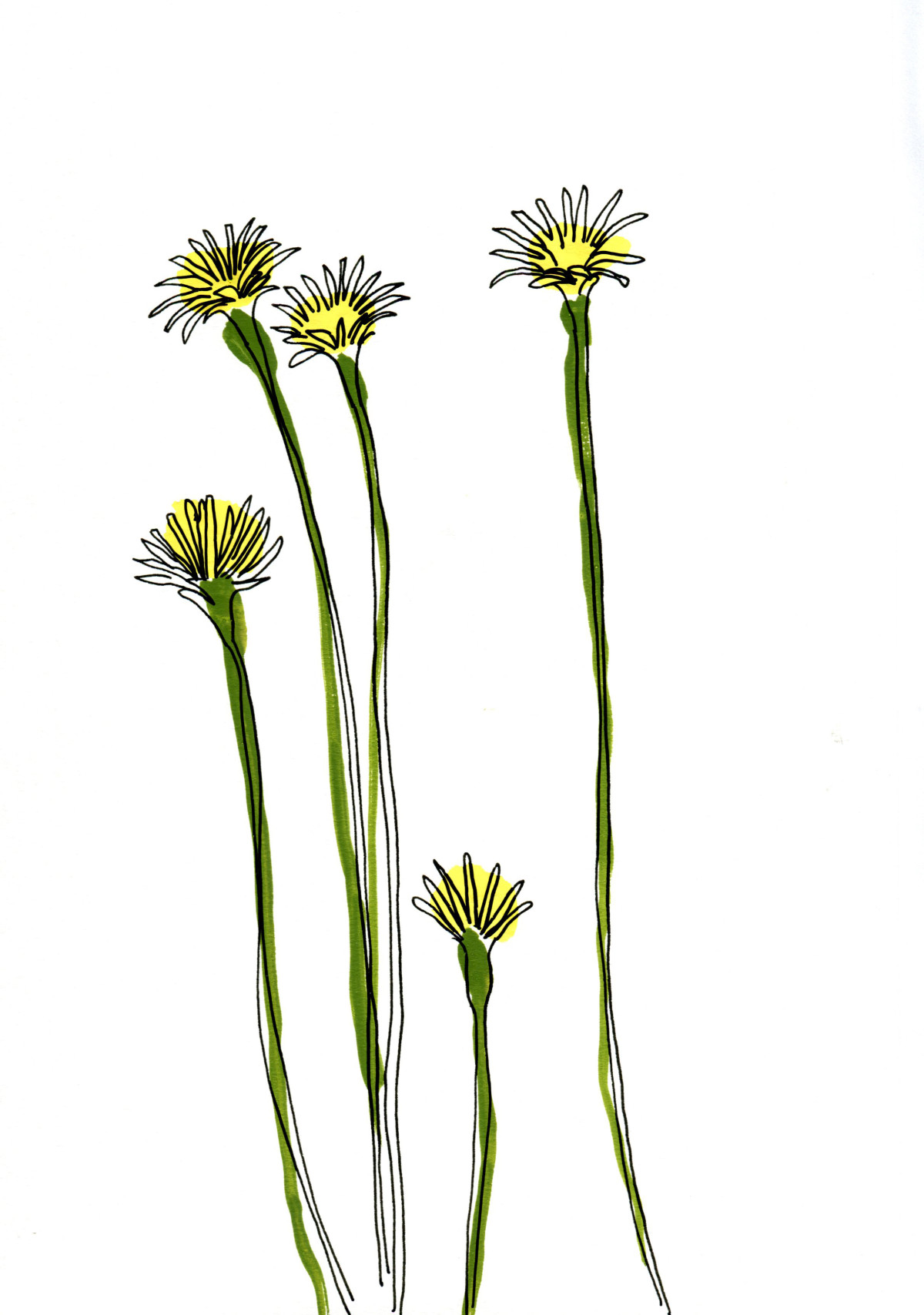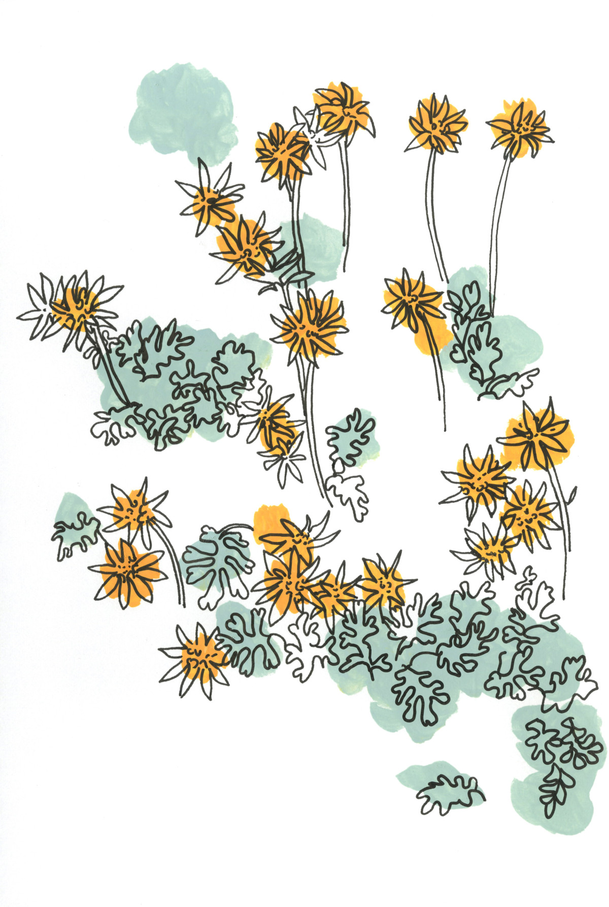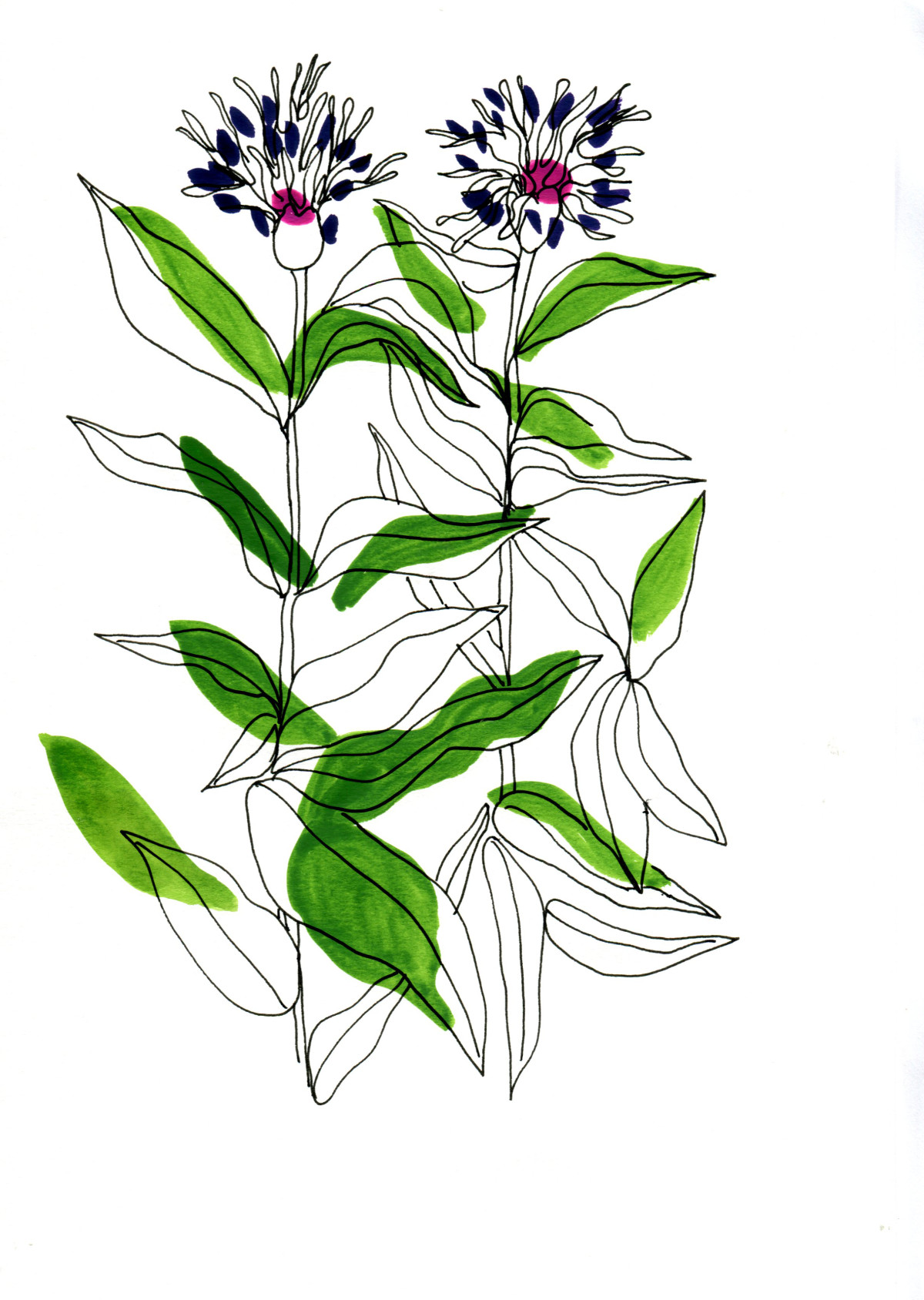 Les dessins de fleurs sont comme une sorte d’herbier surprenant débuté lors d’une résidence artistique à Sion en 2015. Ce travail s’inscrit dans les liens crées entre les randonnées en nature et le dessin. Les fleurs sont photographiées dans leur milieu naturel, puis à partir de ces images, une recherche sur la couleur des fleurs s’effectue comme point de départ. A l’aquarelle, une ou deux nuances de la plante sont déposées sur le papier. Le dessin à la ligne s’inscrit ensuite directement mettant en évidence l’aspect graphique des plantes.Des décalages entre les surfaces colorées et les lignes à l’encre de Chine se produisent donnant à cet «herbier» un caractère singulier.