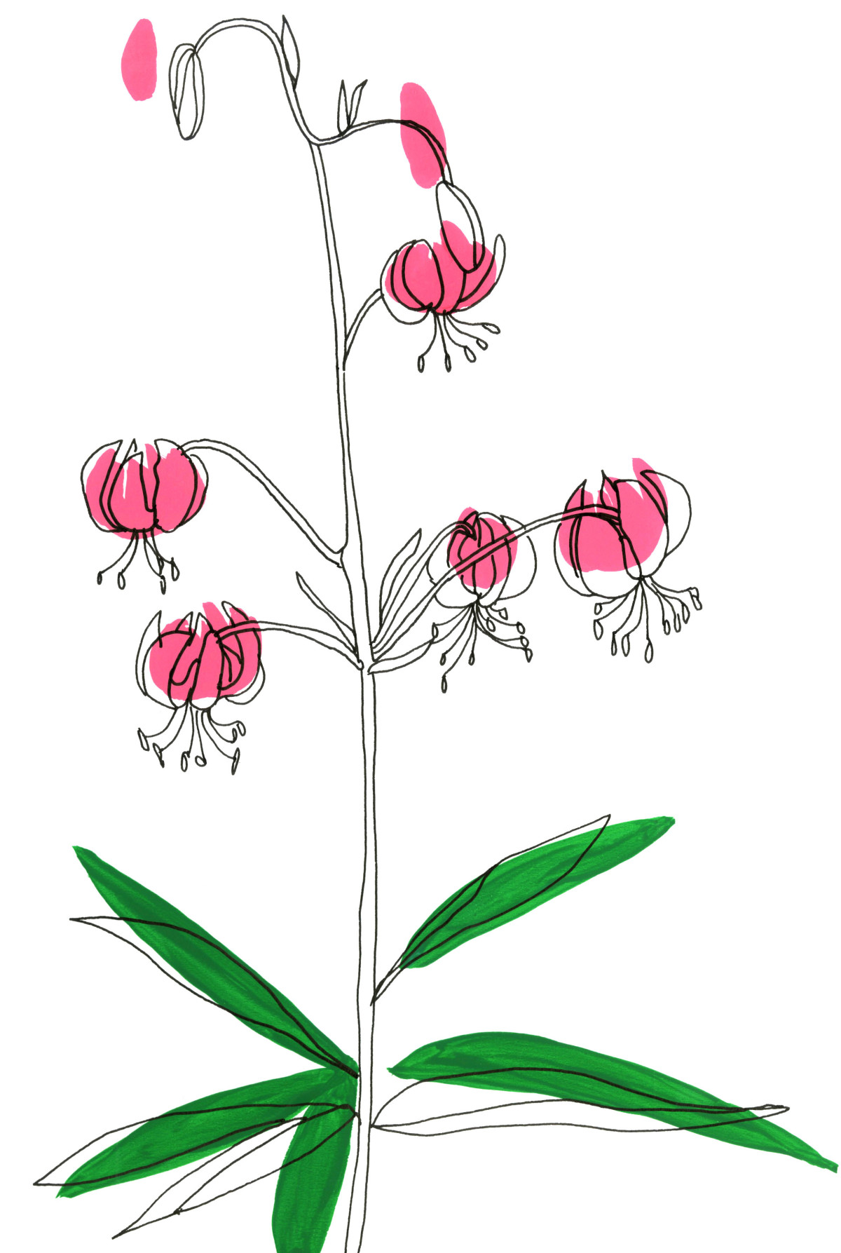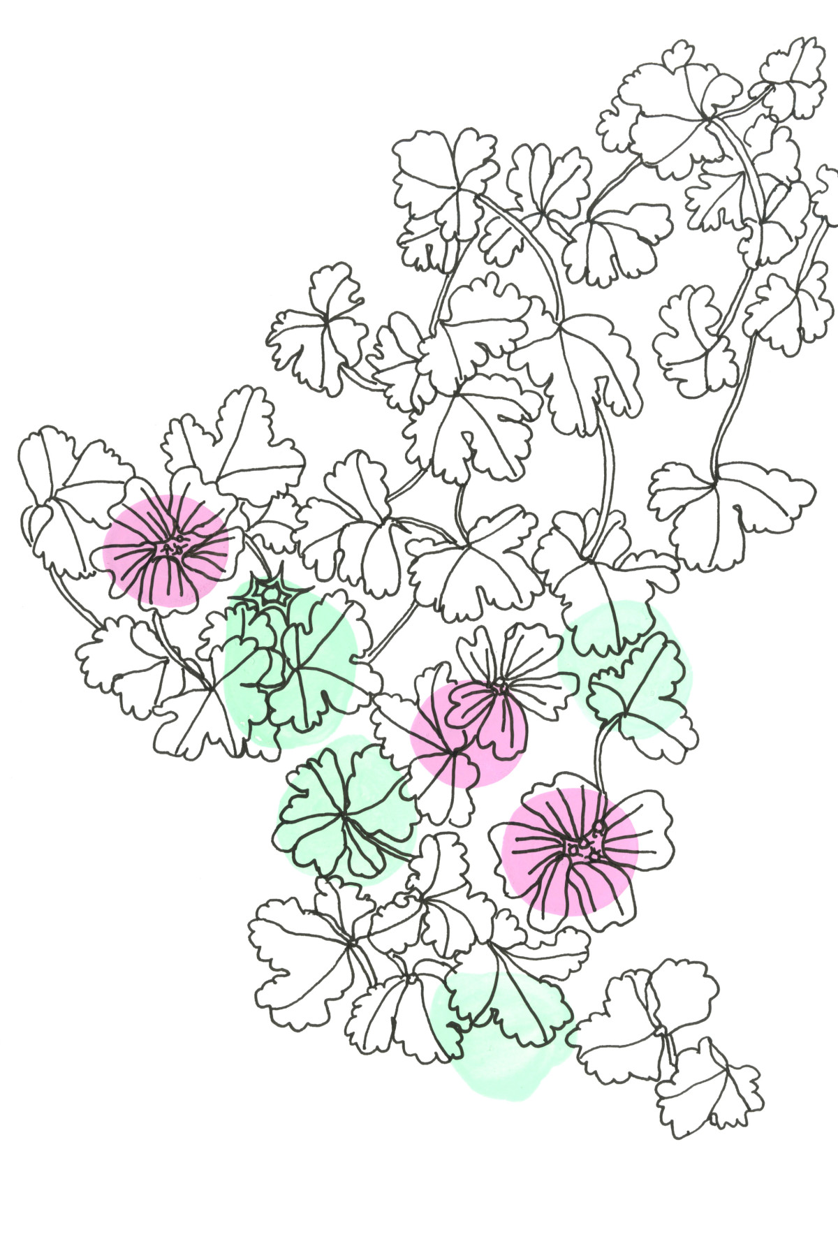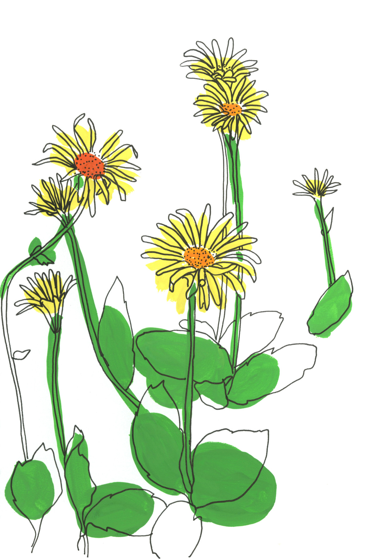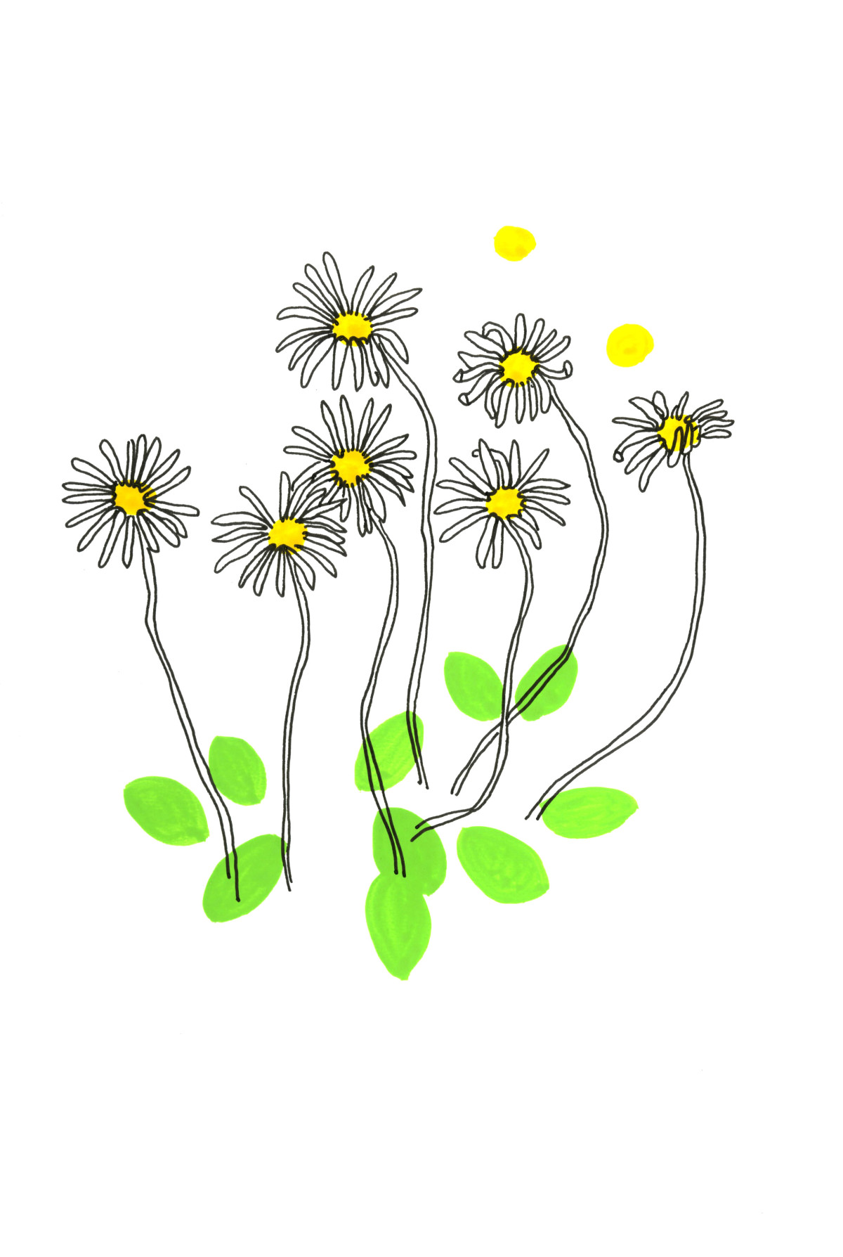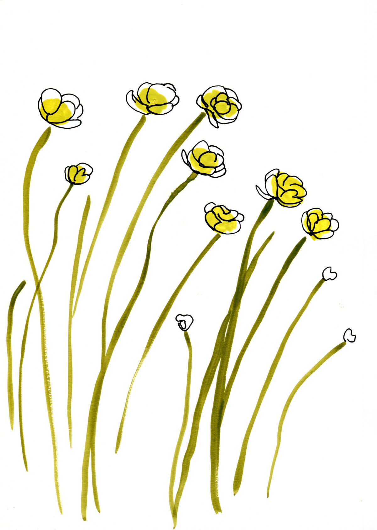 Les dessins de fleurs sont comme une sorte d’herbier surprenant débuté lors d’une résidence artistique à Sion en 2015. Ce travail s’inscrit dans les liens crées entre les randonnées en nature et le dessin. Les fleurs sont photographiées dans leur milieu naturel, puis à partir de ces images, une recherche sur la couleur des fleurs s’effectue comme point de départ. A l’aquarelle, une ou deux nuances de la plante sont déposées sur le papier. Le dessin à la ligne s’inscrit ensuite directement mettant en évidence l’aspect graphique des plantes.Des décalages entre les surfaces colorées et les lignes à l’encre de Chine se produisent donnant à cet «herbier» un caractère singulier.