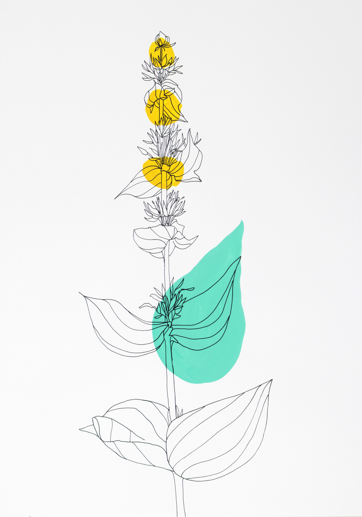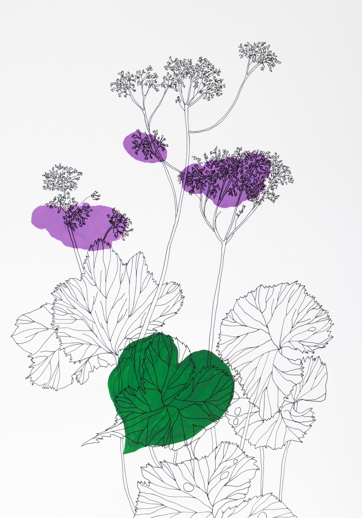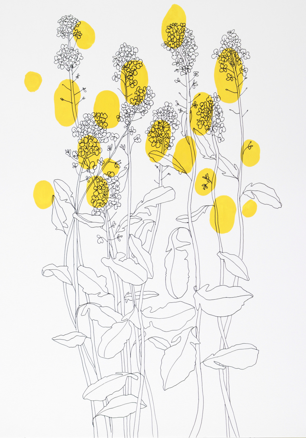 Pour l’exposition Nuances, les tracés à l’encre de Chine se mêlent à une ou deux formes colorées, – initialement déposées sur la surface du papier – comme élément déclencheur. Sorte d’indice minimal de notre monde polychrome, le choix des couleurs issu d’une recherche entre réalité et mémoire concentre ainsi ses qualités évocatrices. L’ensemble des dessins présentés suggérant des variations illimitées.