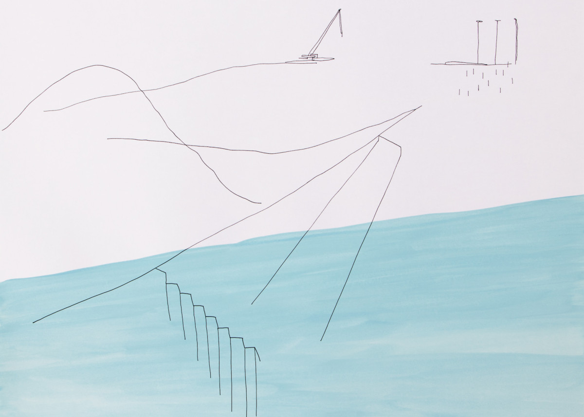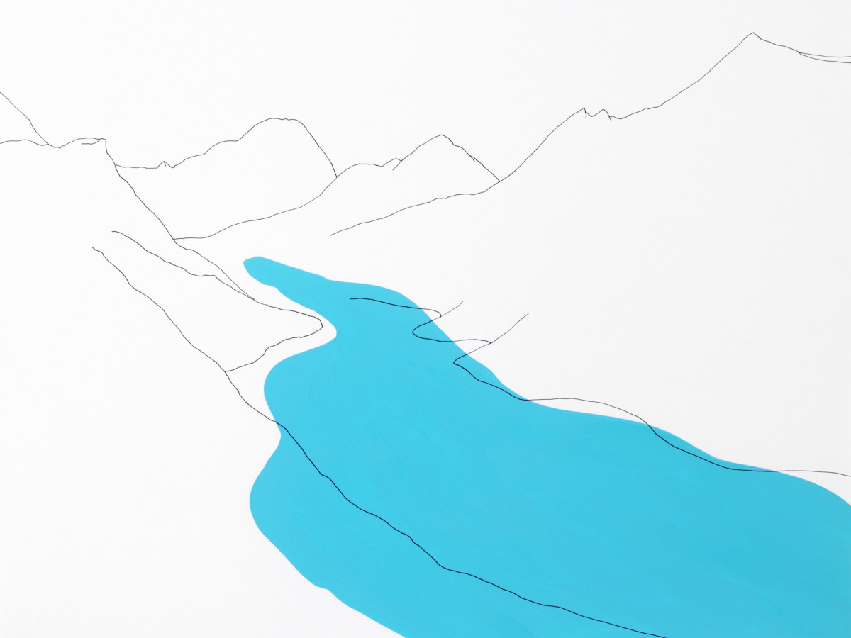 En relation avec les formes colorées peintes en aplat, des lignes dessinent le paysage en construisant des volumes et ouvrant des perspectives. Les compositions sobres ménagent l’expression des tracés, laissant ainsi une certaine liberté d’interprétation afin de susciter des réminiscences. Entre ces deux éléments graphiques – forme-ligne –, des décalages se produisent, soulignant de cette manière des rapports de temporalités différentes ; geste du dessin, rapide et lent à la fois, mais aussi temps plus infini de la nature où, souvent, les transformations de l’érosion demeurent invisibles, si ce n’est la vision d’éboulements qui se sont produits dans le passé.
