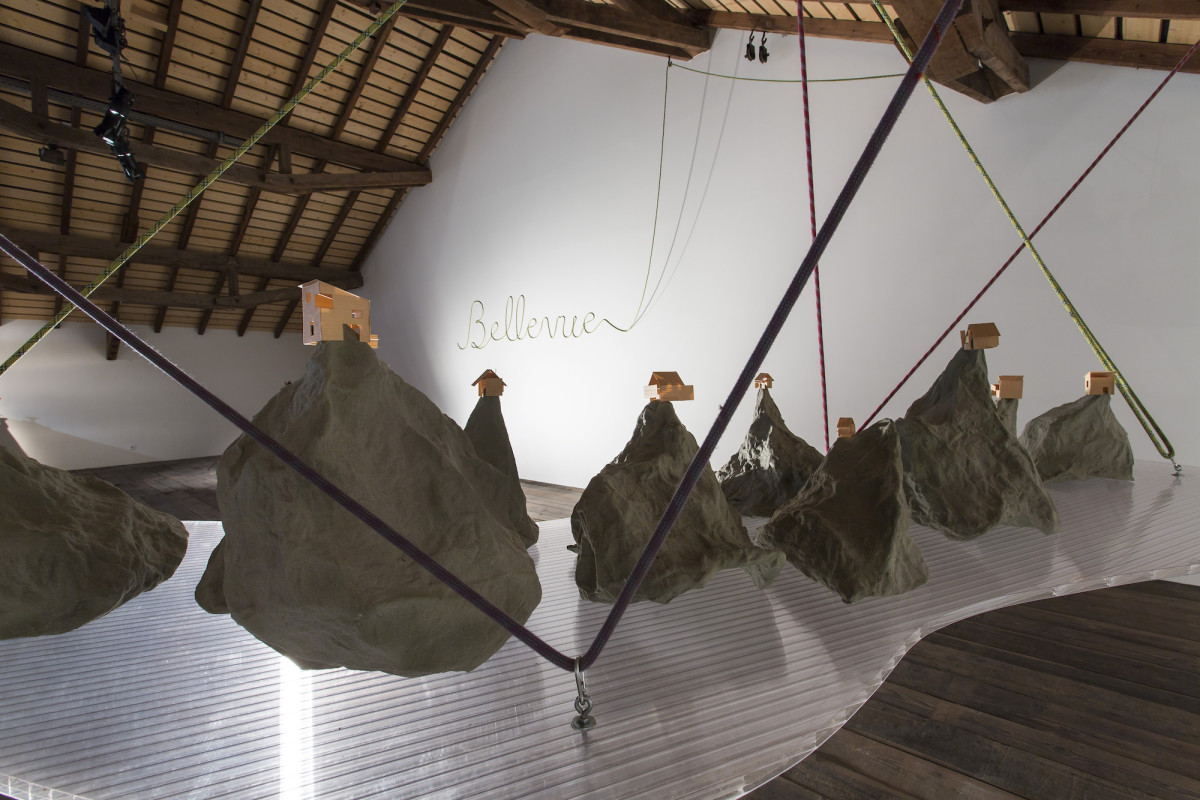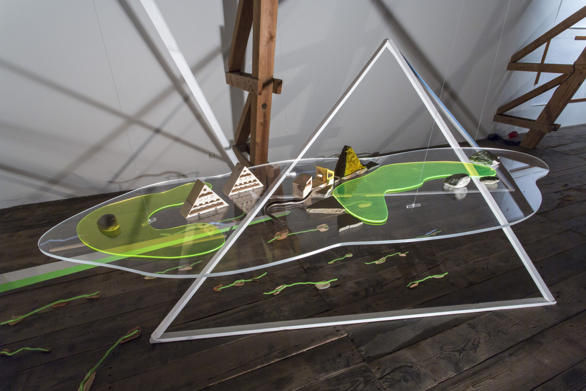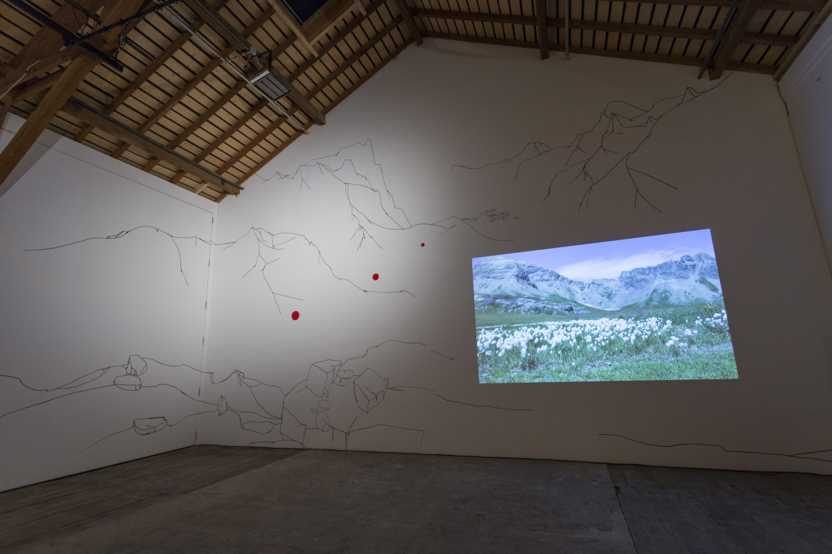 « Le point de départ est une résidence de trois mois à la Ferme-Asile de Sion. Le résultat est l’investissement de la grange, un vaste espace d’exposition de 800m2. Le duo d’artistes installé à Genève a profité de l’invitation estivale pour sillonner le Valais en voiture, en train, en car postal, à vélo et à pied, pour observer, filmer, dessiner et collecter des objets. Ces emprunts tirés de la réalité apparaissent dans l’installation comme des ancrages vécu. Cailloux, coquilles d’escargots, fragments de briques, plumes d’oiseaux, mais aussi brosses à dents, planche de skate, raquette de badminton, sac à dos, cordes d’alpinismes, le plus souvent détournés avec humour, servent de contrepoint au ressenti de leur expérience. L’expression des souvenirs d’une émotion, que ce soit lors d’échange avec les habitants, des impressions visuelles comme le va-et-vient du regard qui passe des hauteurs montagneuses à la plaine du Rhône, l’observation des paysages, l’écoute des sons, la contemplation de la douceur du mouvement de l’eau, le passage soudain et bruyant d’un avion militaire, est ce qui distingue les deux artistes qui travaillent régulièrement ensemble depuis 2011.