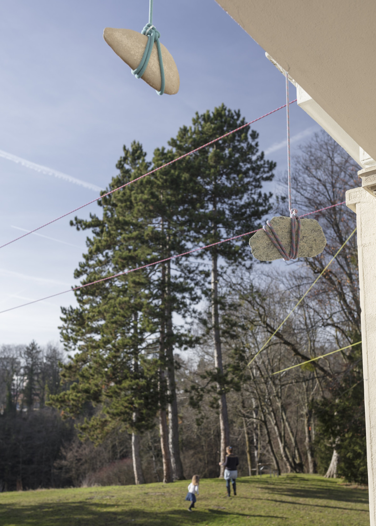 Sur les thèmes de la tension et de la « dis-corde », Pascale Favre et Thomas Schunke se servent de cordages d’alpinisme et des pierres pour créer des foyers qui se déploient dans les espaces d’exposition et d’autres plus intermédiaires avant de s’échapper par les fenêtres de la maison. Par ces liens, les différentes pièces sont réunies et reliées à l’extérieur de la Villa. Attachées au bout de ces cordes, les pierres servent à la fois d’amarrage tout en assumant l’aspect de fugitifs. On retrouve dans le concept de cette œuvre créée in situ à la fois la rigueur architecturale de Pascale Favre et l’humour décalé de Thomas Schunke, avec un clin d’œil à ses performances musicales, comme les pierres utilisées sont dotées de cette qualité.