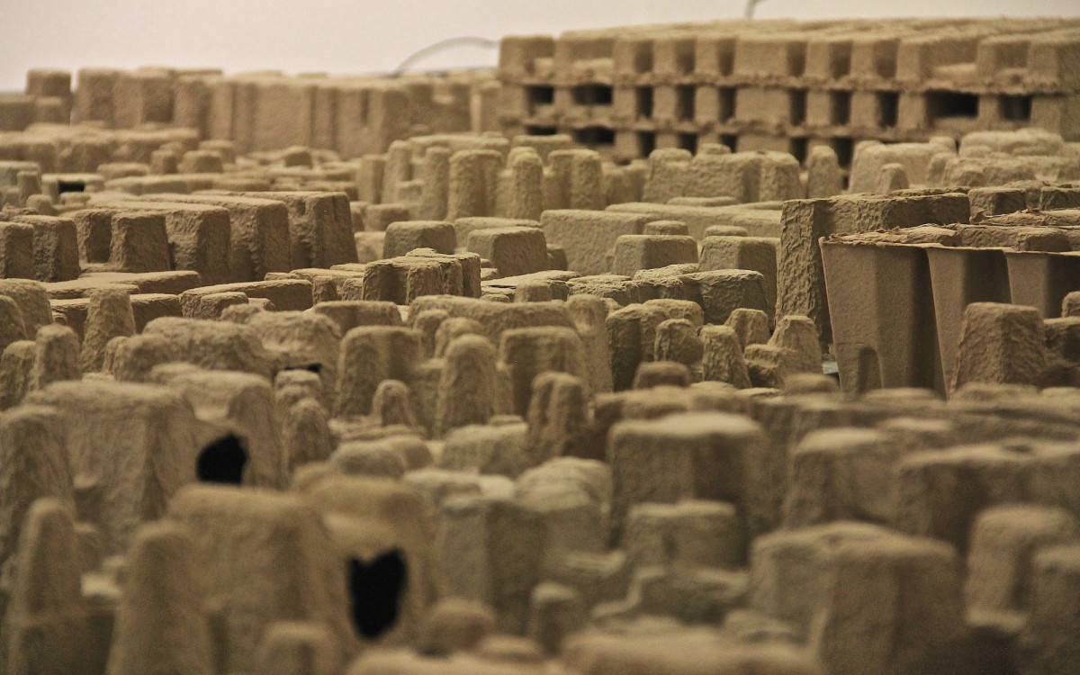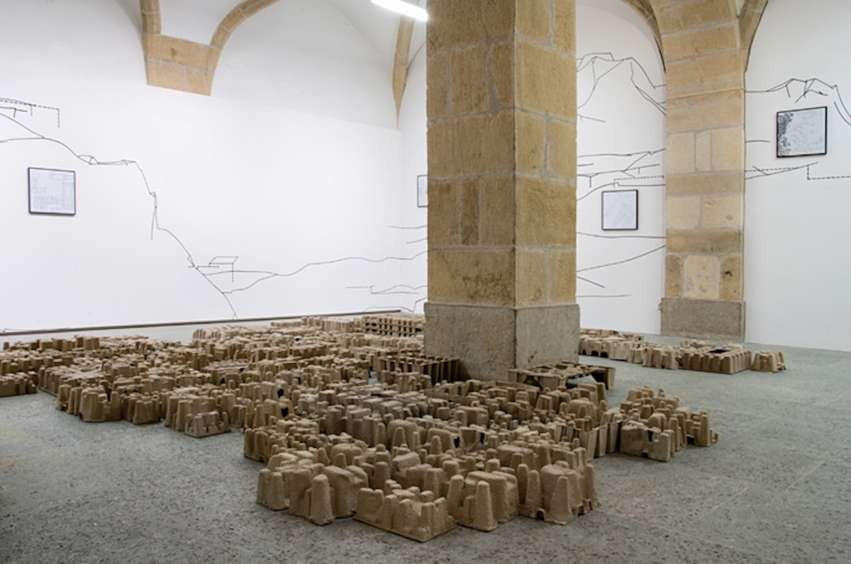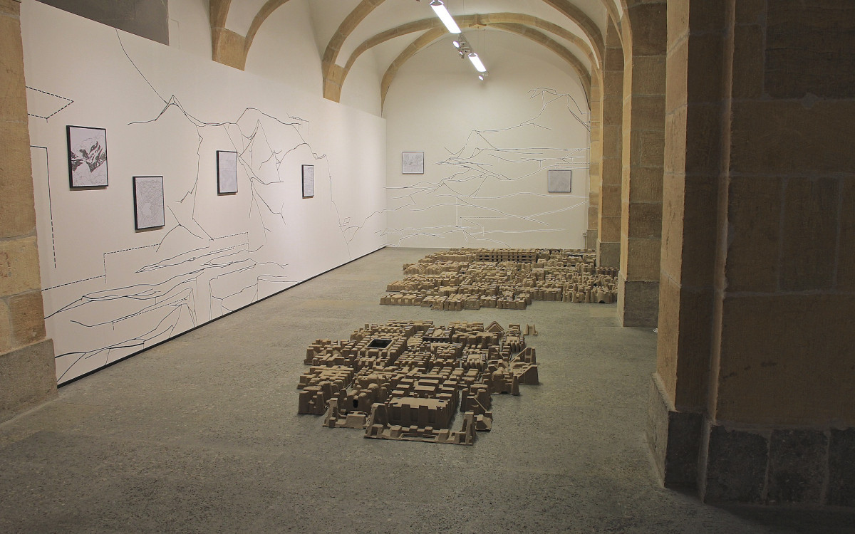Des boîtes sont disposées à même le sol. Il s'agit de cartons moulés qui protègent les appareils électroniques, les cartouches d'imprimantes, etc. Ces éléments recueillis au hasard des trouvailles le soir et le matin avant la relève hebdomadaire des vieux papiers constituent une sorte de collection engagée cinq ans avant l'exposition. Isolés, les éléments sont des objets sans valeur sculpturale particulière, mais installés ensemble, ils évoquent la projection d'une ville. Le jeu des combinaisons urbanistiques s'étend de telle manière qu'il permet au regard de se perdre en plongeant directement dans les diverses structures architectoniques. L'ensemble de la maquette au sol est en relation avec un dessin mural qui l'enveloppe en même temps qu'il suggère une ouverture. C'est un environnement rappelant divers paysages qui se combinent. Les traits noirs façonnent des perspectives transformant les surfaces blanches des cimaises en une sorte d'infini. La maquette vue du dessus et le dessin regardé de face proposent au spectateur des situations de point de vue en mouvement.