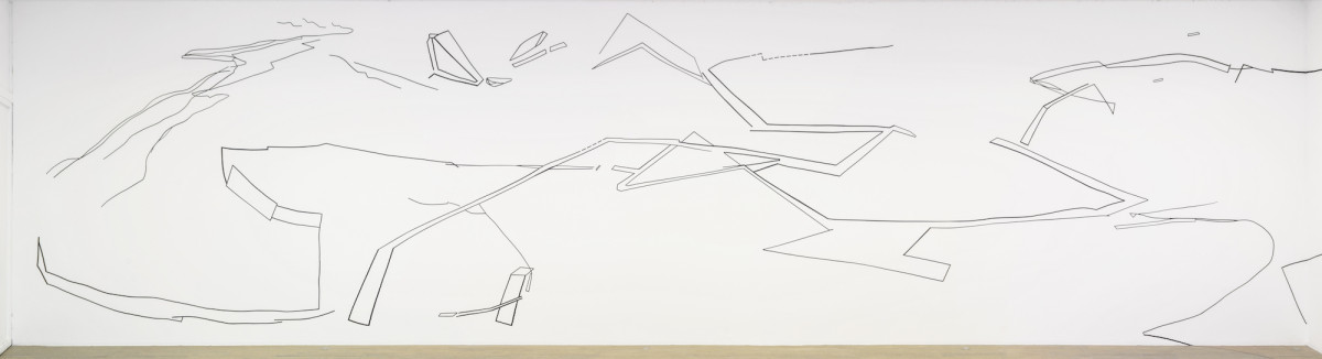 Lignes intérieures | Le lacis de lignes libres et multiples, fragmentées ou continues, dessinent des sortes de paysages qui abolissent matérialité et verticalité des murs. Ceux-ci deviennent le support d’une transformation possible, d’un espace ouvert par des tracés qui fuient et des perspectives qui se déploient en surface. Indices de réseaux et de formes qui révèlent une activité mentale plus que l’image d’un panorama immédiatement reconnaissable. Esquisse sans mesure d’une expression de la pensée qui raconterait en même temps la fugacité et l’accomplissement d’une idée.