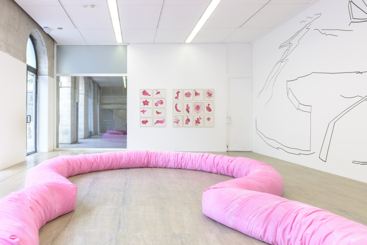 Figurations intérieures | Installé sur le sol, un tube en tissu – présence physique – détermine un espace plus confiné. Par sa texture et sa forme il se réfère à l’organe invisible de l’extérieur mais également au plan d’une proto-architecture. L’habitation-organique vue autant comme une protection qu’un réceptacle est peinte en rose car s’il est vrai que cette couleur se rapproche de la chair elle rend aussi compte du floral et du féminin.