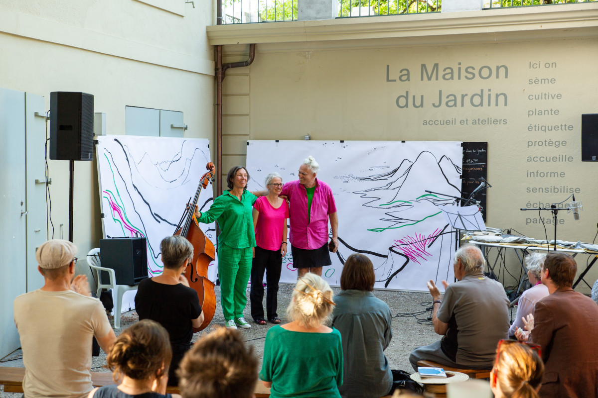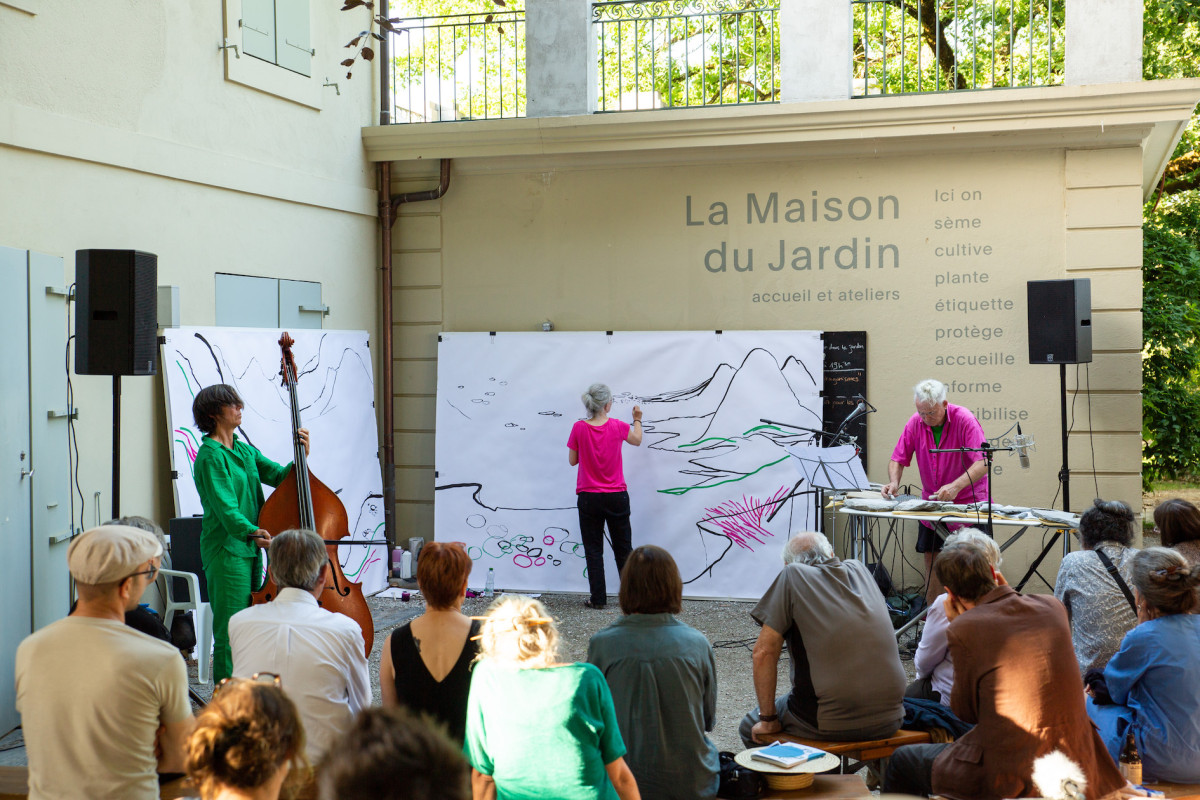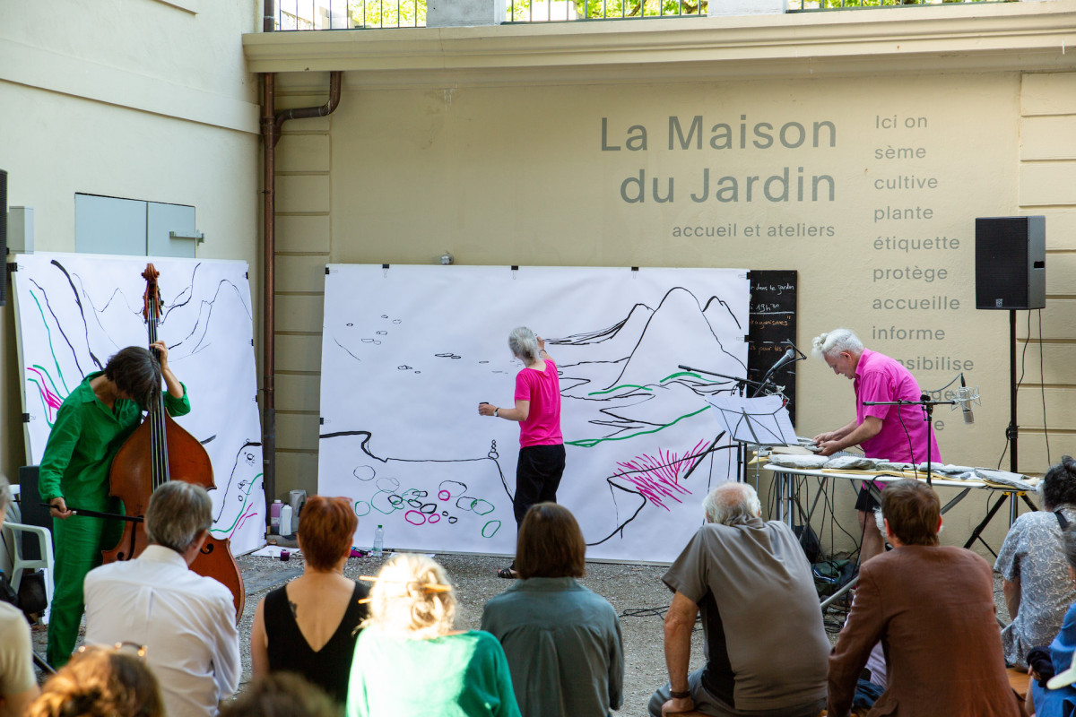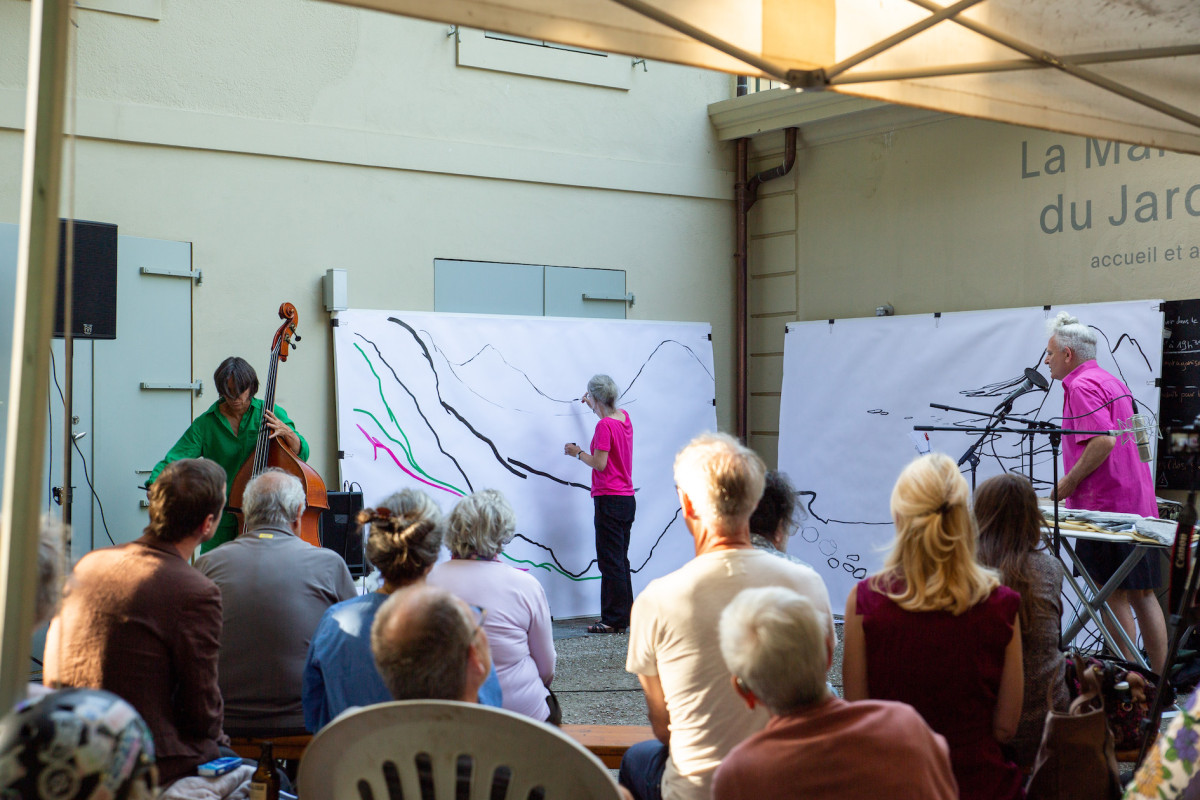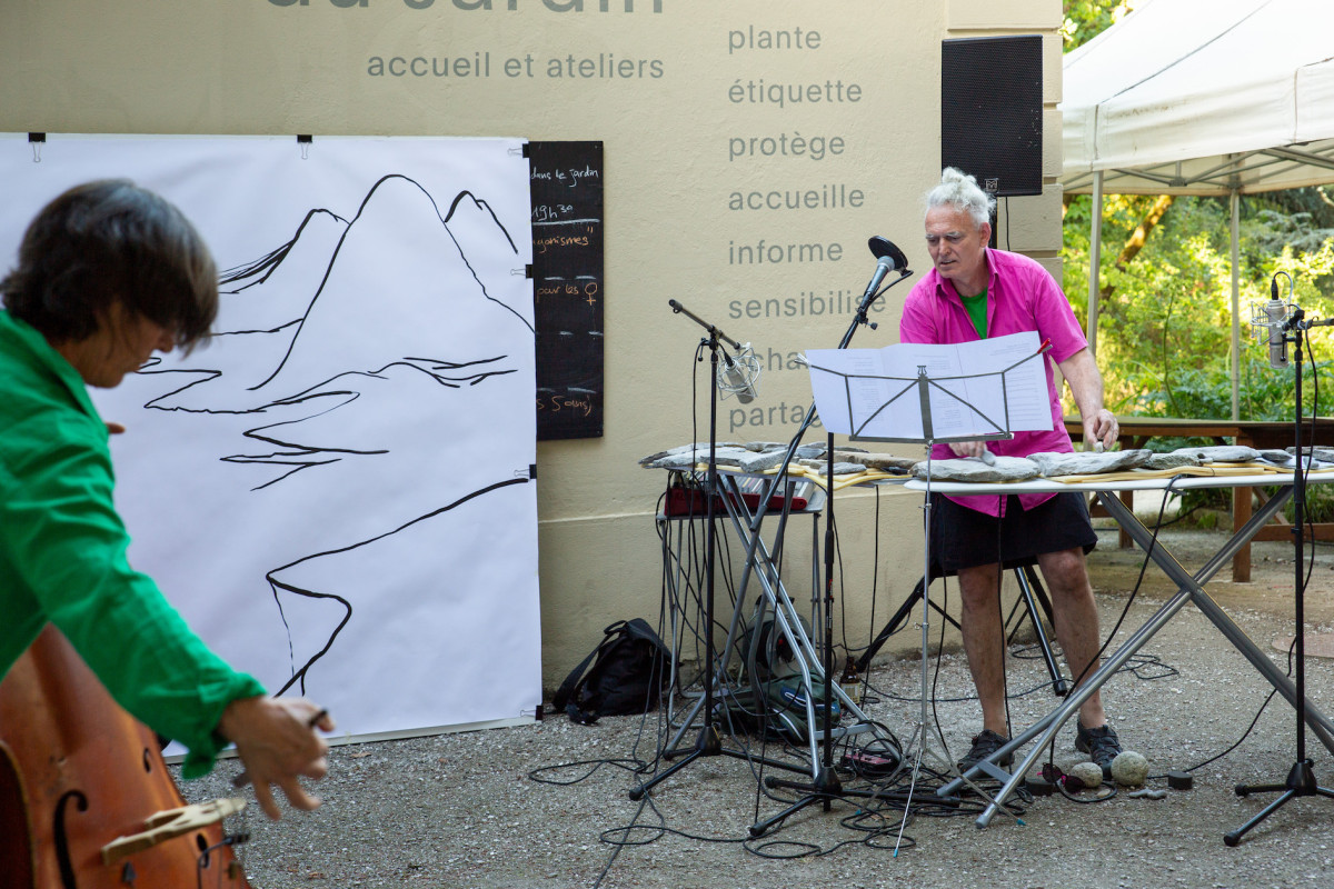 Rêver comme une pierre Une collaboration de Noëlle Reymond, contrebasse, Pascale Favre, dessin, Thomas Schunke, lithophone et voix